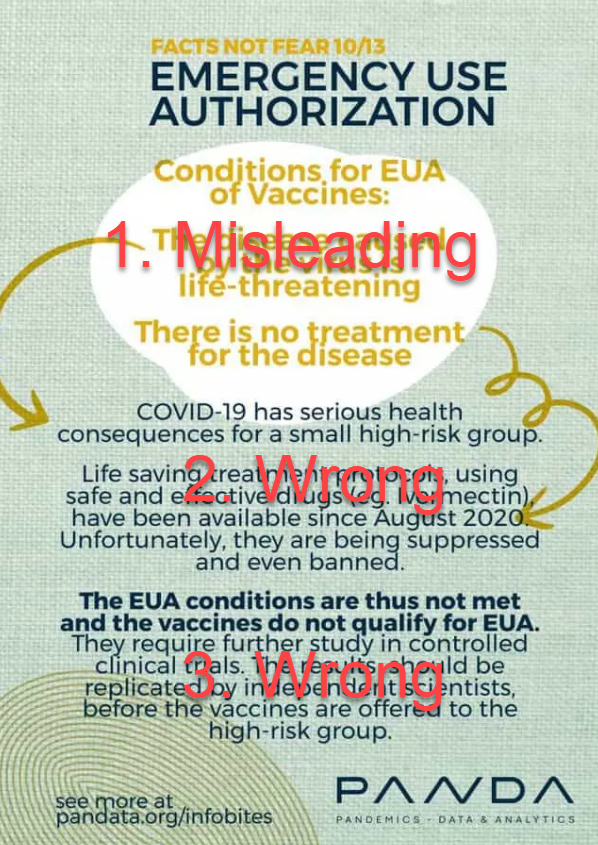 Recently Pandemic Data Analysis (PANDA) has started spreading "infobites" under the heading "Facts Not Fear". Here I address these and show how they are misrepresenting facts. Number 10/13 addresses Emergency Use Authorisation (EUA) of COVID-19 vaccines.