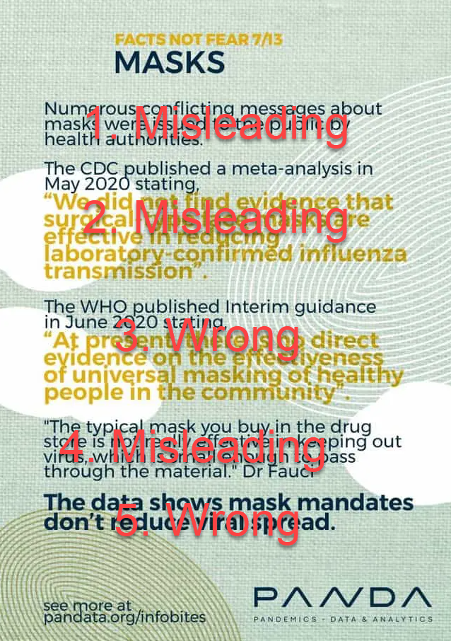 Recently Pandemic Data Analysis (PANDA) has started spreading "infobites" under the heading "Facts Not Fear". Here I address these and show how they are misrepresenting facts. Number 7/13 addresses masks.